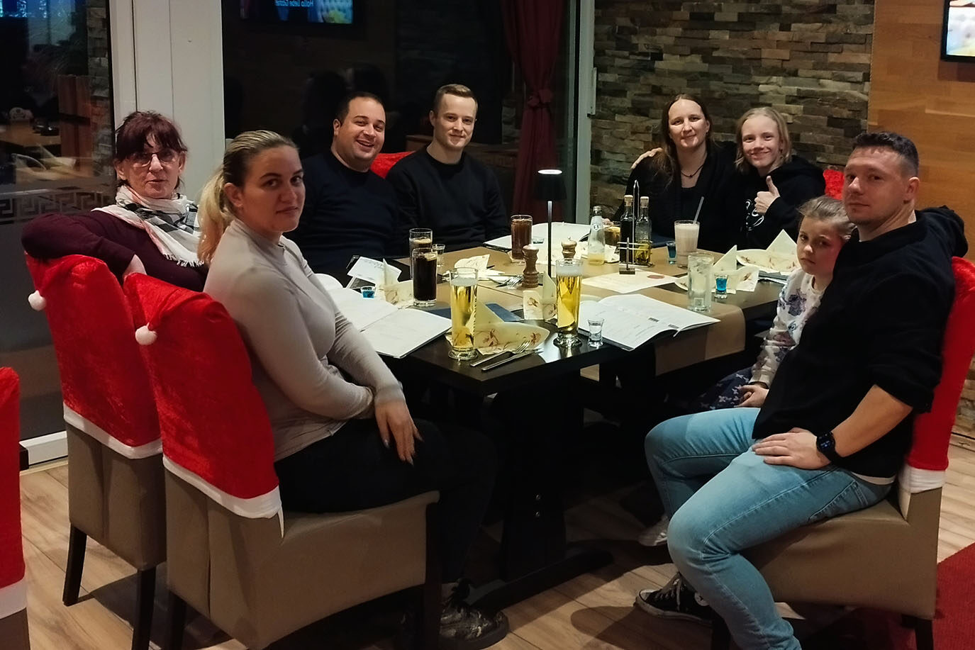 Nach dem ereignisreichen Nachmittag voller Action war es Zeit für den gemütlichen Teil unseres Abends. Gemeinsam machten wir uns auf den Weg in ein griechisches Restaurant in der Nähe, das für seine großzügigen Portionen und herzliche Atmosphäre bekannt ist. Dort wartete bereits ein festlich gedeckter Tisch auf uns, und bei leckerem griechischen Essen und Getränken wurde angeregt geplaudert, gelacht und auf das vergangene Jahr zurückgeblickt.